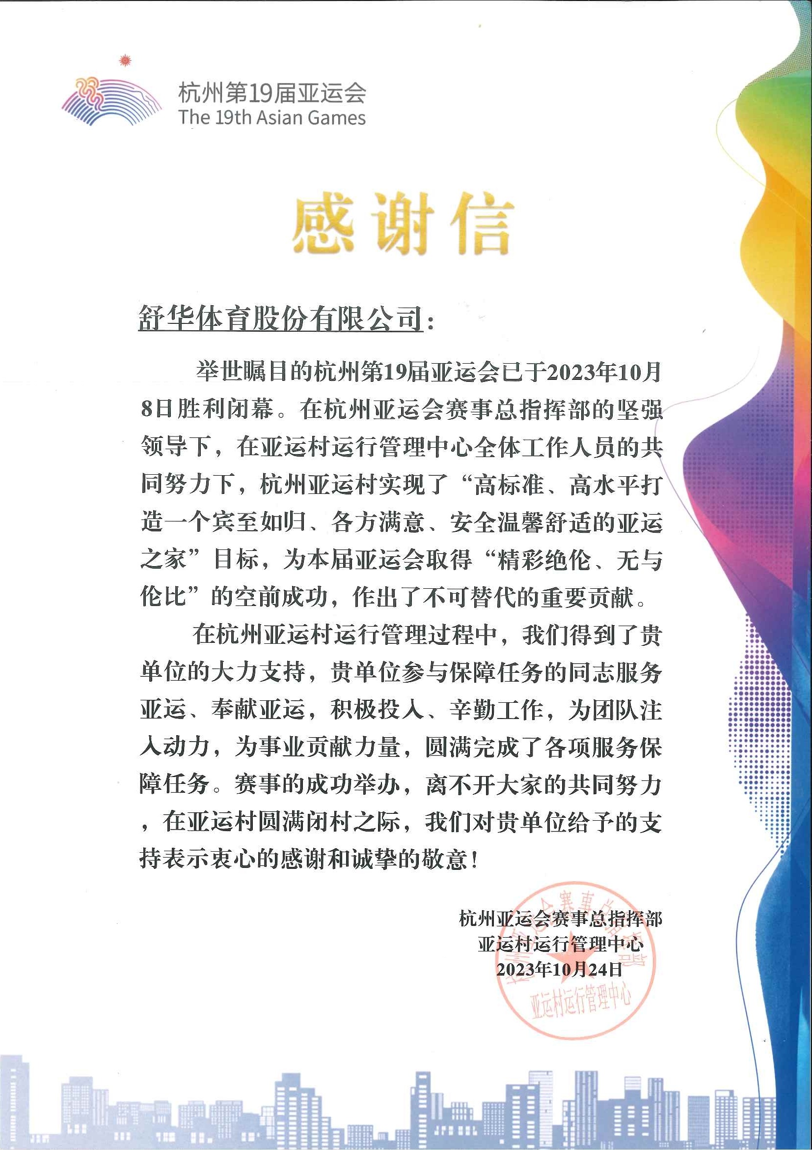 2023 杭州第19届亚运会感谢信 杭州亚运会赛事总指挥部亚运村运行管理中心 感谢信 查看